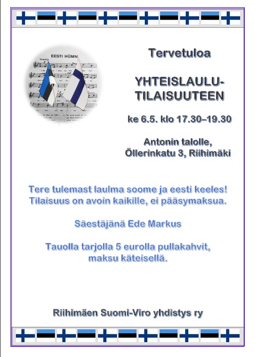 Riihimäen Suomi-Viro yhdistys järjestää suomen- ja vironkielisen yhteislaulutilaisuuden Riihimäen Antonin talon salissa keskiviikkona 6.5.2026 klo 17.30–19.30. Illan säestäjänä on virolainen Ede Markus.